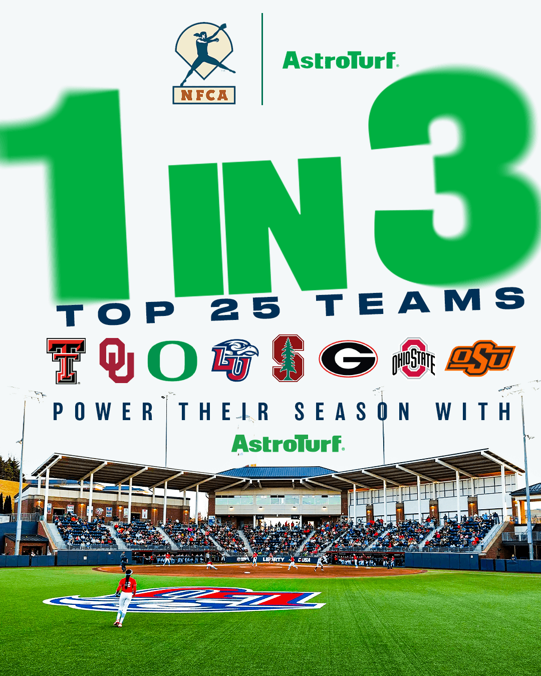 Today, 1 in 3 NFCA Top 25 programs utilize AstroTurf somewhere within their softball environment. For some, that means a full-field system. For others, it’s an outfield installation, a halo or non-clay area, or a high-use training space that supports daily repetitions. The common thread is that top programs are prioritizing surfaces that hold their performance standard from preseason through postseason, without being at the mercy of constant repairs or weather-driven disruptions.