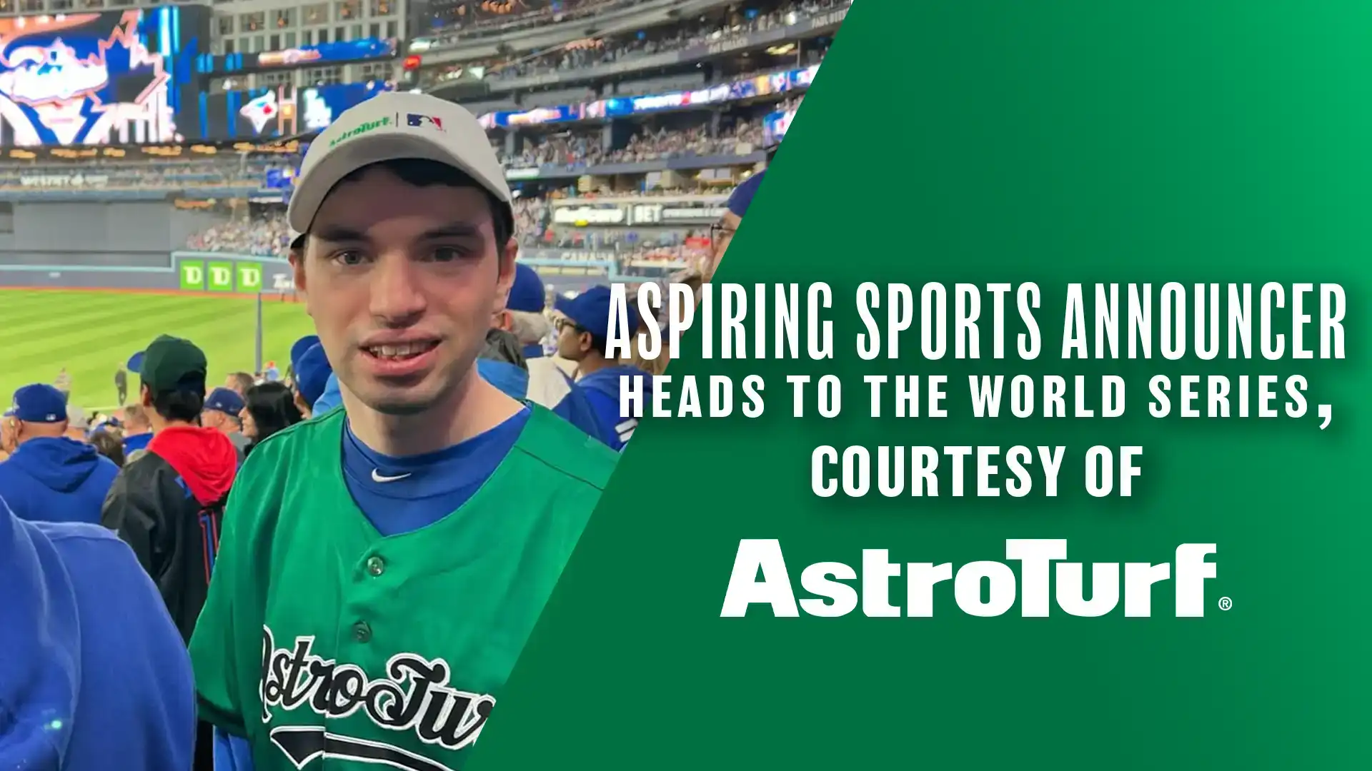 SYRACUSE, N.Y. | AstroTurf.com | October 29th, 2025 — Syracuse student and aspiring sports announcer Finn O’Brien attended Game 2 of the World Series in Toronto. The baseball enthusiast witnessed the historic game at Rogers Centre between the Toronto Blue Jays and Los Angeles Dodgers courtesy of AstroTurf®.