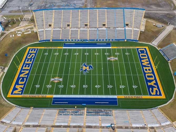 Lake Charles, Louisiana – In record time, McNeese State University installed premium AstroTurf® Rhino Blend 46 synthetic sports turf on the field at Cowboy Stadium after two devastating hurricanes in 43 days and the global pandemic put a halt to the 2020 football season.