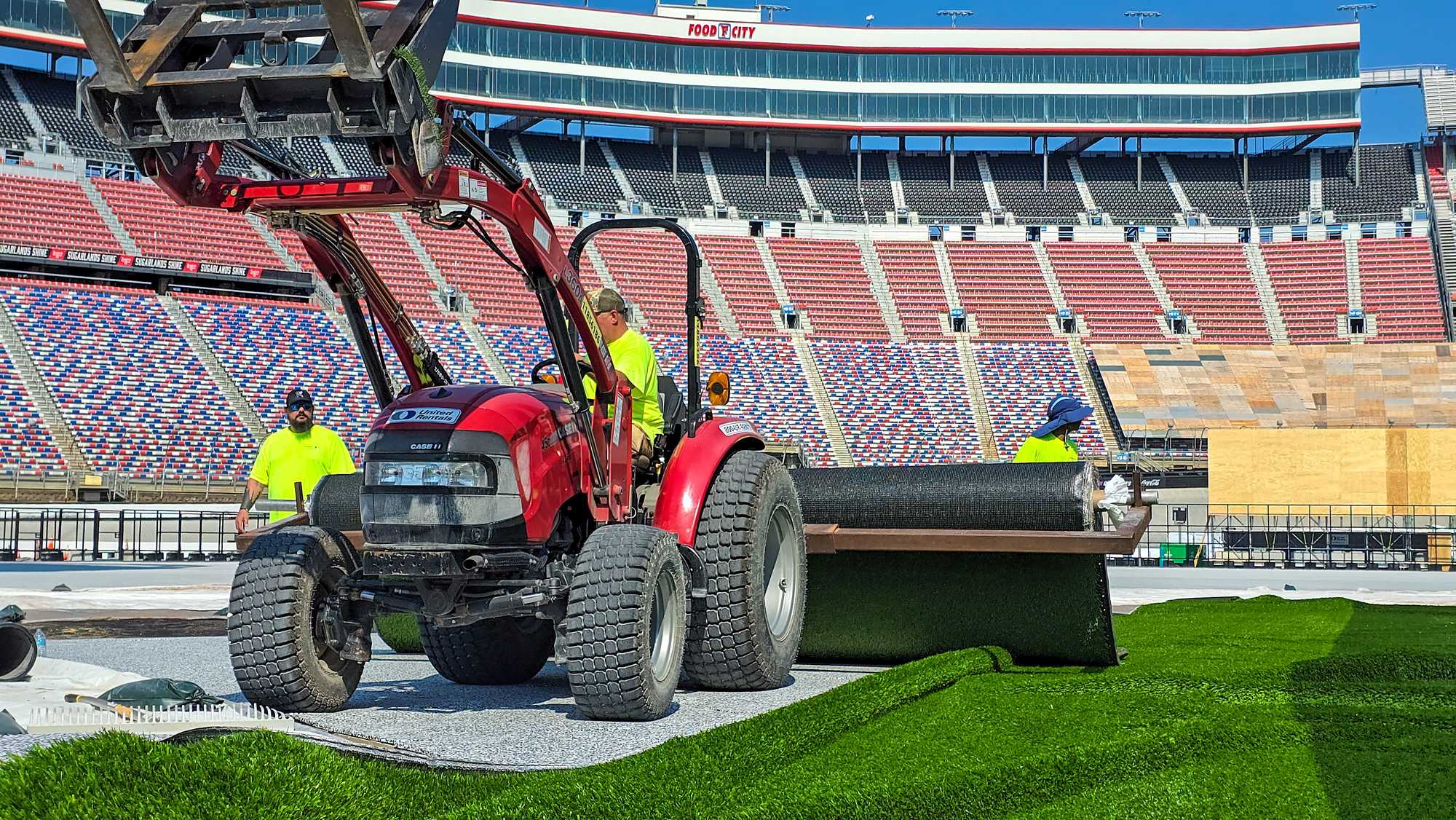 Demolition began in June, with crews removing pit walls, signage and lights to clear room for the ballpark. Construction phase began a few weeks later, when granite and fill were bought in to flatten the foundation for the field. Layer by layer, a sub-base was constructed, complete with drainage infrastructure. The installation of AstroTurf Diamond Series synthetic turf system had a quick turnaround of only 10 days.